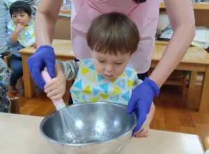 給食の岡田さんと一緒に、泡立て器でボウルに入ったお酢、油、塩をまぜまぜすると…