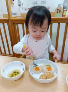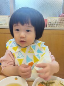 1歳児はすぐにお花に気づいて、「これなに」と言いながら、真っ先にニンジンを食べる子がほとんどでした。