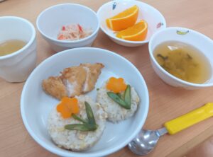 ナーサリールームでは素敵なお花飾りのかやくご飯の献立でした。