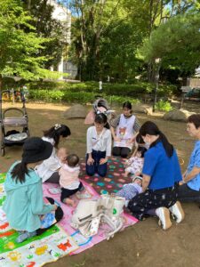 『つんく つんく』『よっこよっこよこのびのびのび』など足を使うふれあい遊び。オーガンジーを使った『じーじーばあ』のわらべうたなどをしました。お母さんとの触れ合いの中で笑顔が見えるお子様たちに癒されながらのんびりとした雰囲気の中、遊ぶことができました。わらべうたをしているとナーサリーの子どもたちが興味をもって様子を見にきます。一緒にわらべうたをやろうとしてくれたり、「かわいいね」と赤ちゃんを見て笑っていました。