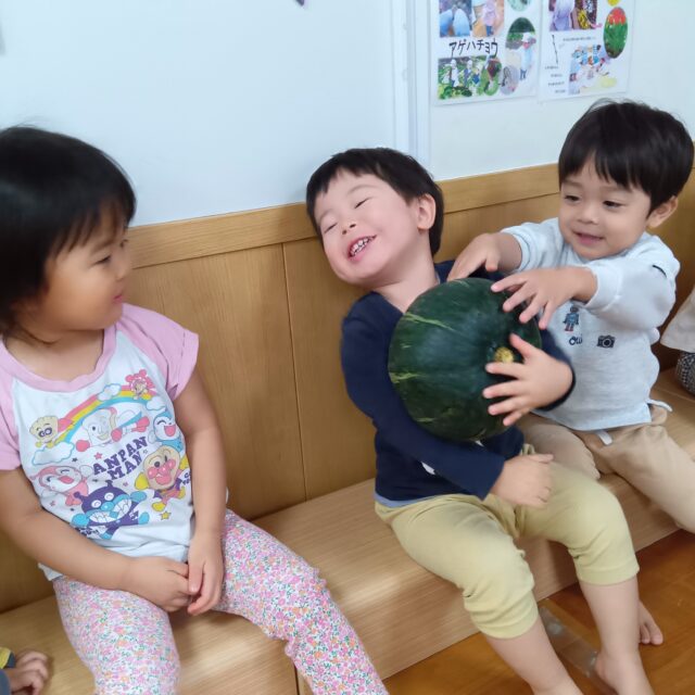 『ぐりとぐらとすみれちゃん』の絵本を読んでから実際に南瓜に触れてみました。